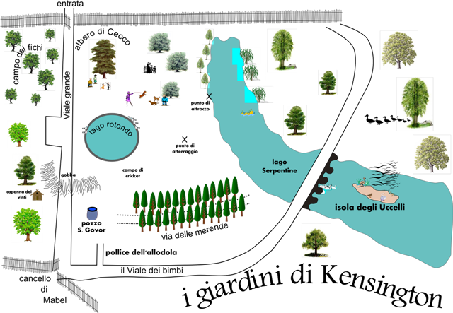 Aiutato con le splendide illustrazioni di Arthur Rackham, il Peter dei giardini di Kensington è un personaggio molto diverso da quello che abbiamo imparato a conoscere grazie ai films della Disney. Un pargoletto di una settimana di vita che fugge, volando, dalla finestra di camera vestito con la sola camicia da notte, per giungere ai giardini di Kensington dove incontra il mondo magico delle fate e degli gnomi. Qui avviene anche il primo incontro con un umana, tale Mannie Mannering, bimba di quattro anni che decide di rimanere nei giardini dopo la chiusura; l’incontro con il suo idolo è ricco di dolcezza e gioca sulla semplicità di Peter o meglio sulla sua natura di mezzo e mezzo, metà umano e metà uccello.