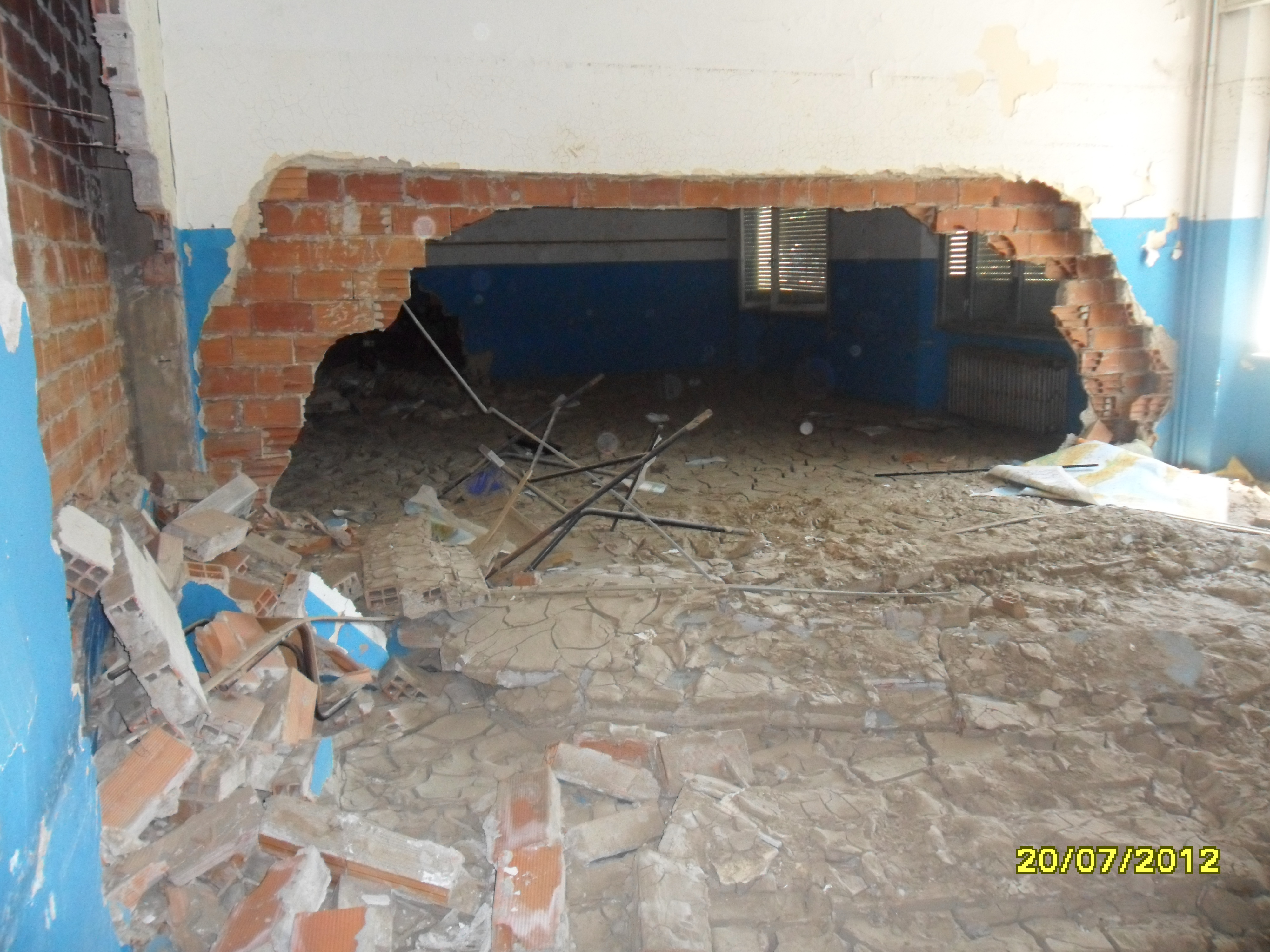 Si nota la tamponatura tra due classi attigue, sfondata dalle acque; la parete realizzata con una specie di muratura a sacco…vuota e, quindi, inadeguata (ma non solo per la spinta della acque!), non ha retto alla corrente del flusso fangoso ed ha ceduto.