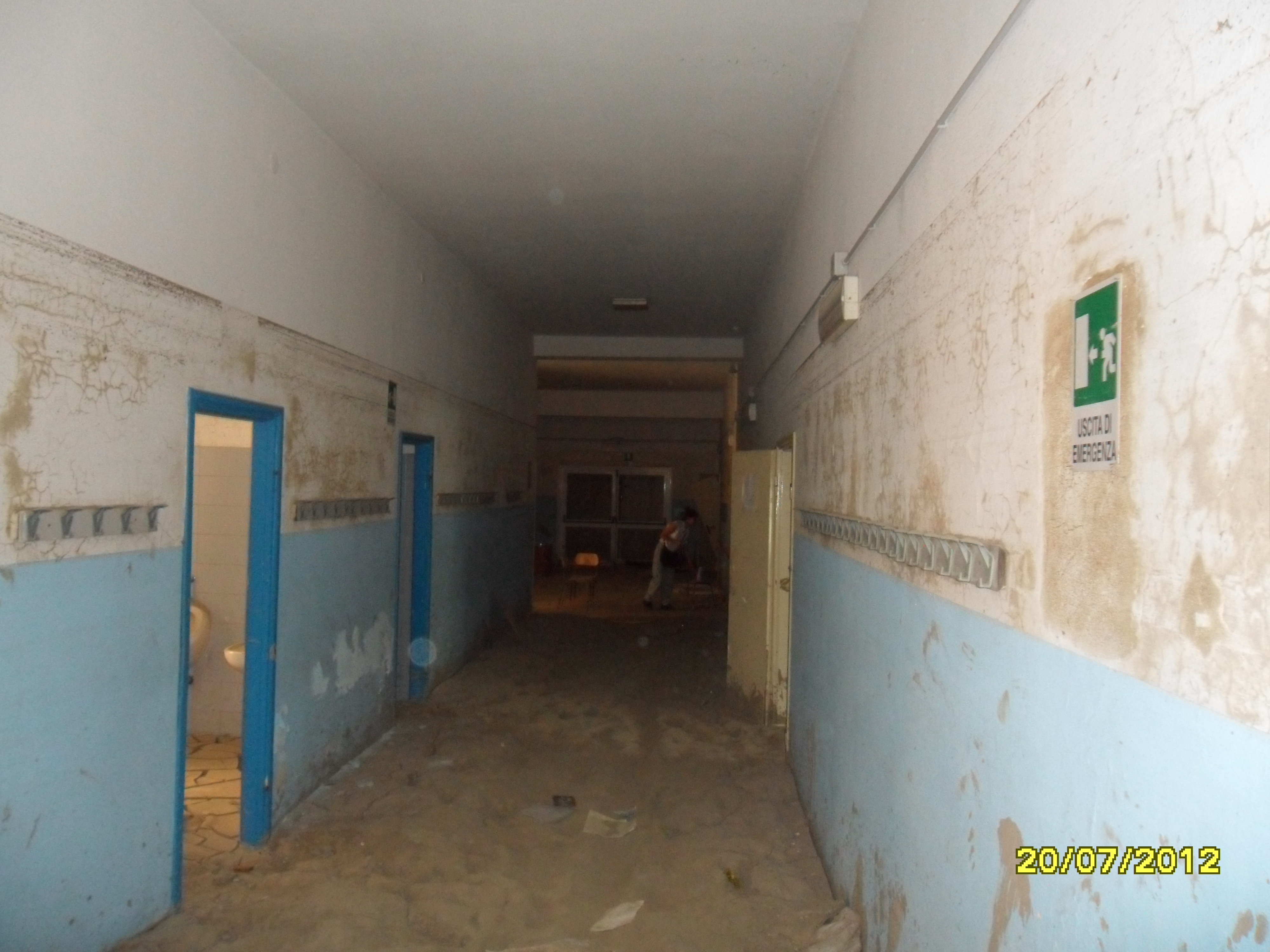 Quello mostrato di seguito è il corridoio al piano primo; si osserva il livello delle acque e fango che hanno raggiunto l’altezza di 2,5 metri dal piano di calpestio.