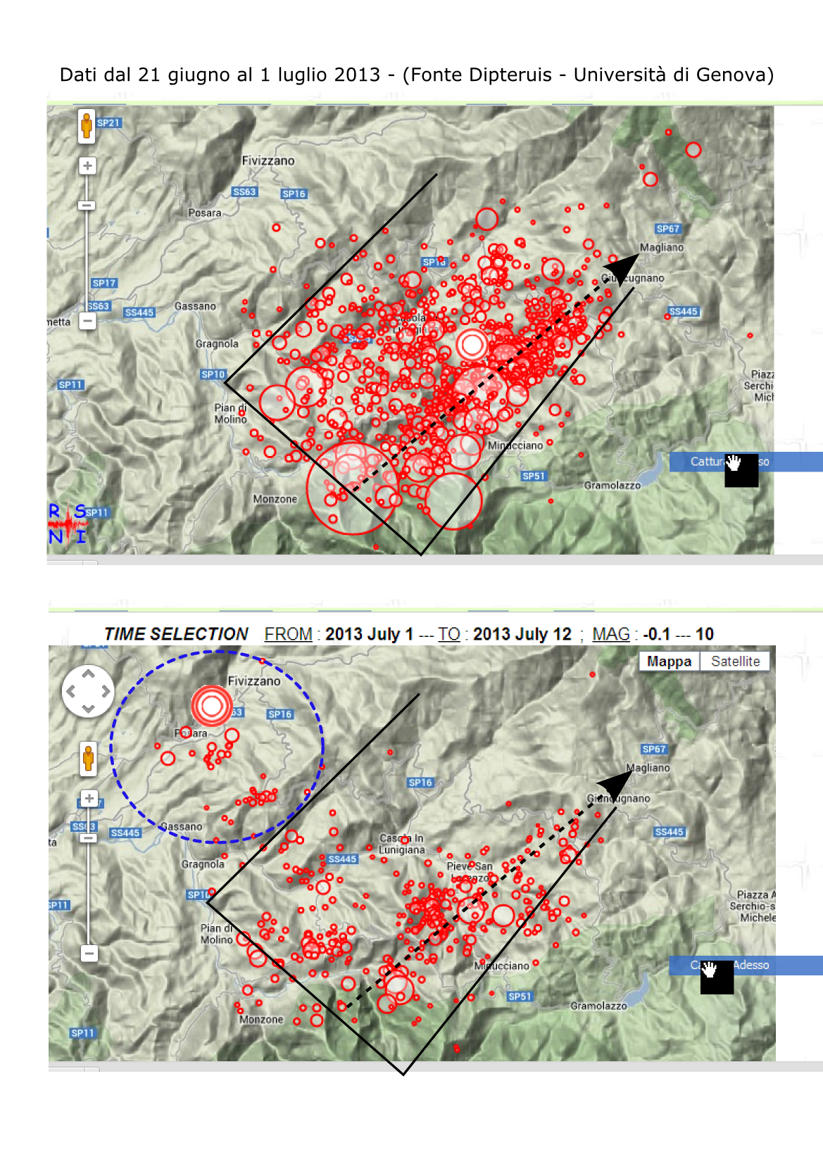 La figura che segue mostra il posizionamento degli epicentri registrati tra il 21 giugno e il 12 luglio 2013 in Alta Toscana (Dati Dipteris – Università di Genova); la prima figura comprende i terremoti fino al 1 luglio, mentre nella seconda sono indicati quelli dal 1 al 12 luglio.