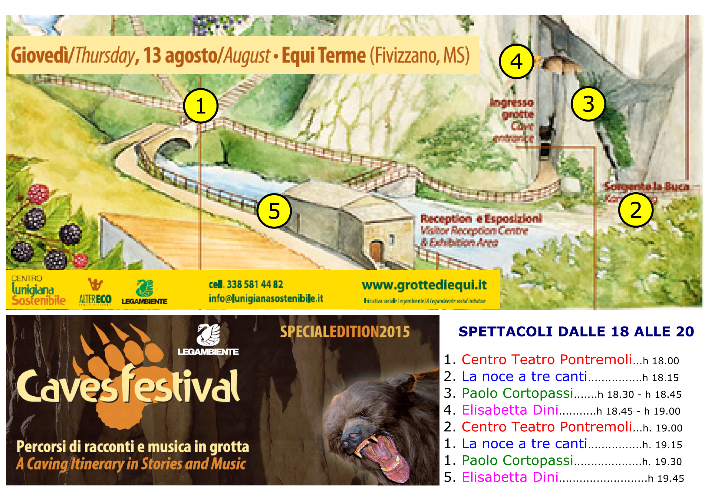 Il Caves festival 2015 si è svolto in una sola giornata, con una serie di attività all’interno del Geo Park gestito da Legambiente Lunigiana. Nel pomeriggio si sono avute diverse rappresentazioni fuori e dentro le grotte, a formare un “PERCORSO DI RACCONTI“, che le molte persone partecipanti, hanno seguito con interesse e divertimento.