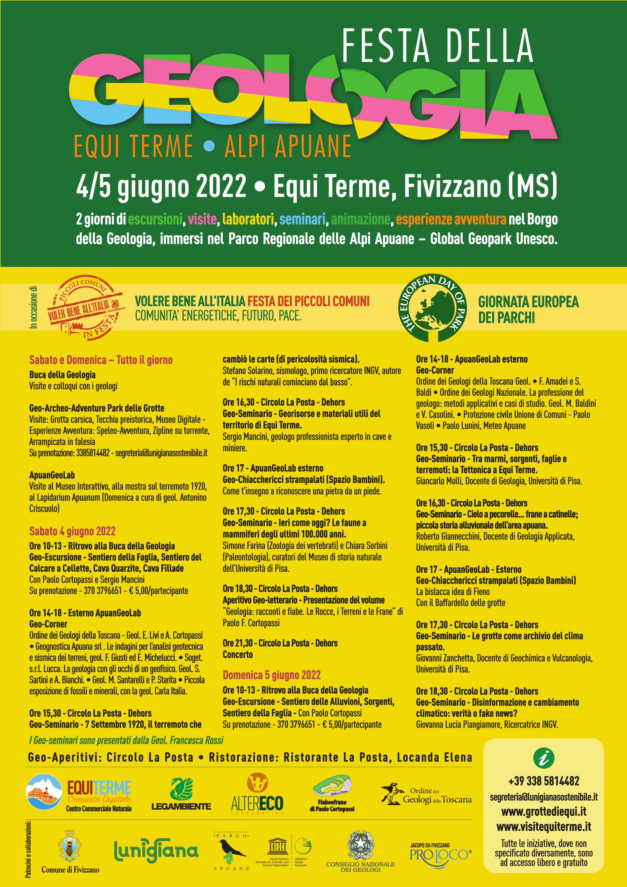 La manifestazione è stata organizzata dall’Unione dei Comuni della Versilia con il patrocinio e la collaborazione del Comune di Stazzema e del Dipartimento di Scienze della Terra dell’Università di Pisa; l’evento si è svolto in convenzione e cooperazione con il Consiglio Nazionale dei Geologi e con il patrocinio della Pro Loco Seravezza del Parco Alpi Apuane, dell’Ordine dei Geologi della Toscana e dell’Istituto di Geoscienze e Georisorse del CNR di Pisa.