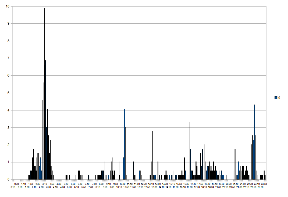 Questi sono dati di una pioggia giornaliera (19 h). Il cumulato (somma dei mm di pioggia, in quasto caso, giornalieri) è molto alto; la distribuzione dell’intensità è abbastanza costante (ogni colonna indica il cumulato in 15 minuti) ; i picchi massimi sono significativi, ma non eccessivi (4 mm/15 min).